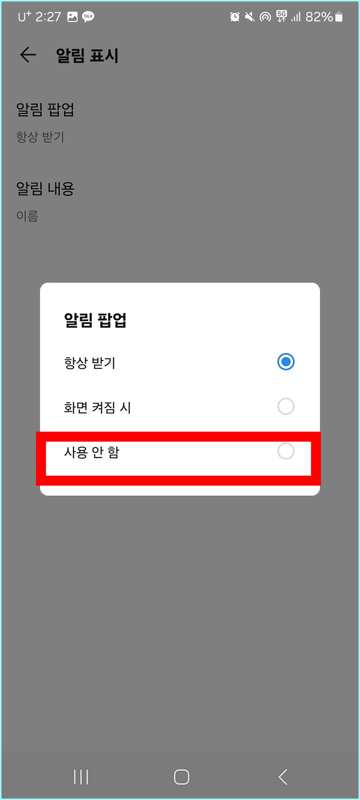 ■ 여기서 항상 받기 / 화면 켜짐 시 / 사용 안 함이 있습니다. 이 중에서 [사용 안 함]을 클릭해주세요. 참고로 화면 켜짐 시의 경우는 여러분들이 핸드폰을 가지고 뭔가를 하고 있을 때만 나오게 설정하는 것 입니다.
