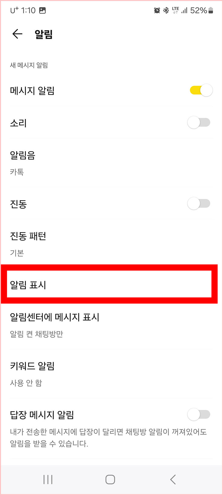 ■ 아래 사진처럼 메시지 알림 옆에 노란색 버튼이 켜져 있으면 카톡 알림이 나옵니다.