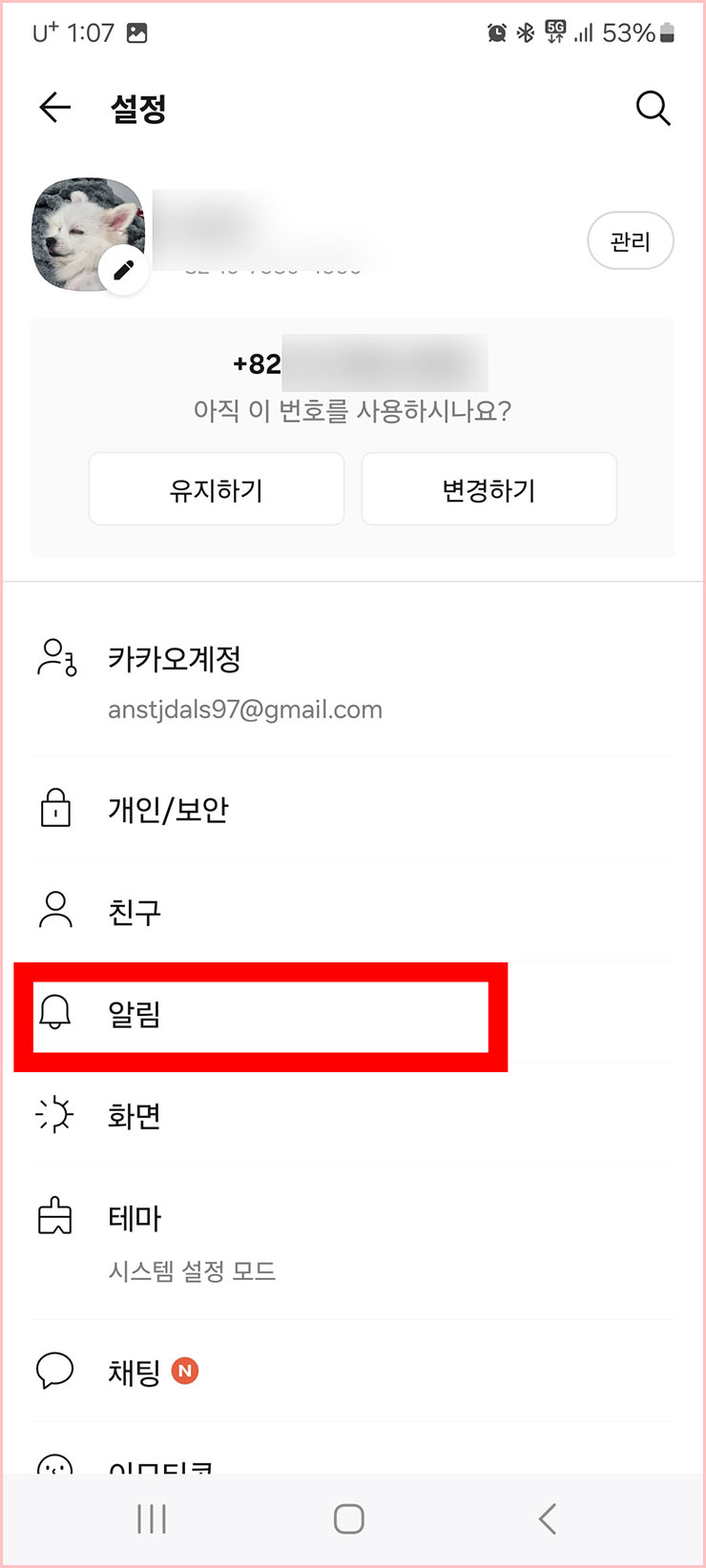 ■ 그 다음에는 [알림]을 클릭해주세요. 보통 스마트폰을 사용하다가 무의식적으로 카카오톡 알림을 꺼버리는 경우가 있습니다. 그럴 때 해결 방법입니다.
