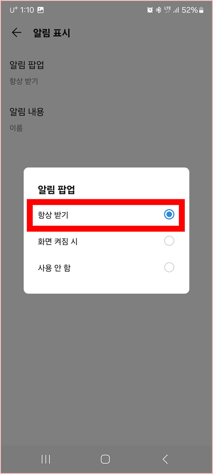 ■ 총 3가지 항목이 나옵니다. 항상 받기 / 화면 켜짐 시 / 사용 안함 순으로 되어 있습니다. 그 중에서 화면이 꺼져 있더라도 팝업이 나오길 희망한다면 [항상 받기]로 설정을 해주세요.