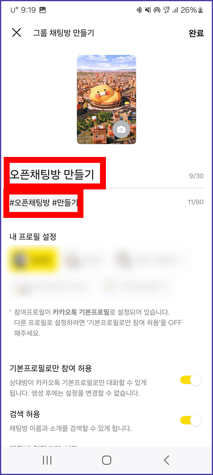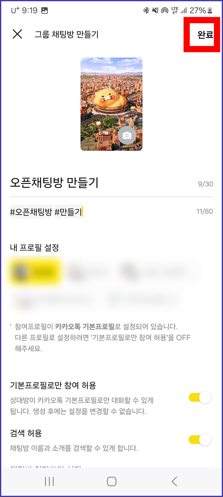 ■ 채팅방명, 해시태그 그 외 설정들을 다 했다면 위에 있는 [완료]를 선택해주세요.