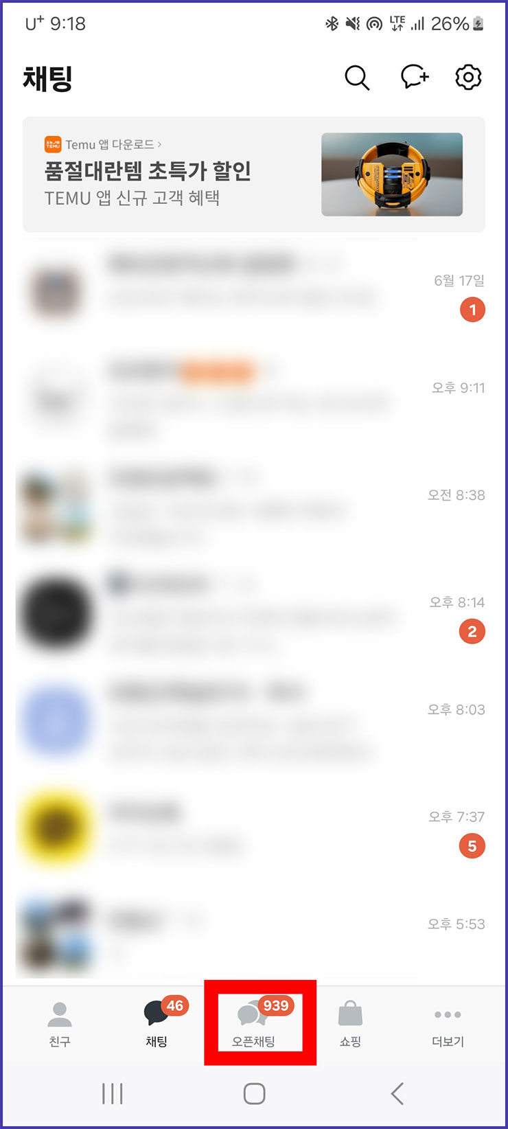 ■ 먼저 아래 쪽에 있는 [오픈채팅]이라고 적혀 있는 아이콘을 선택해주세요.