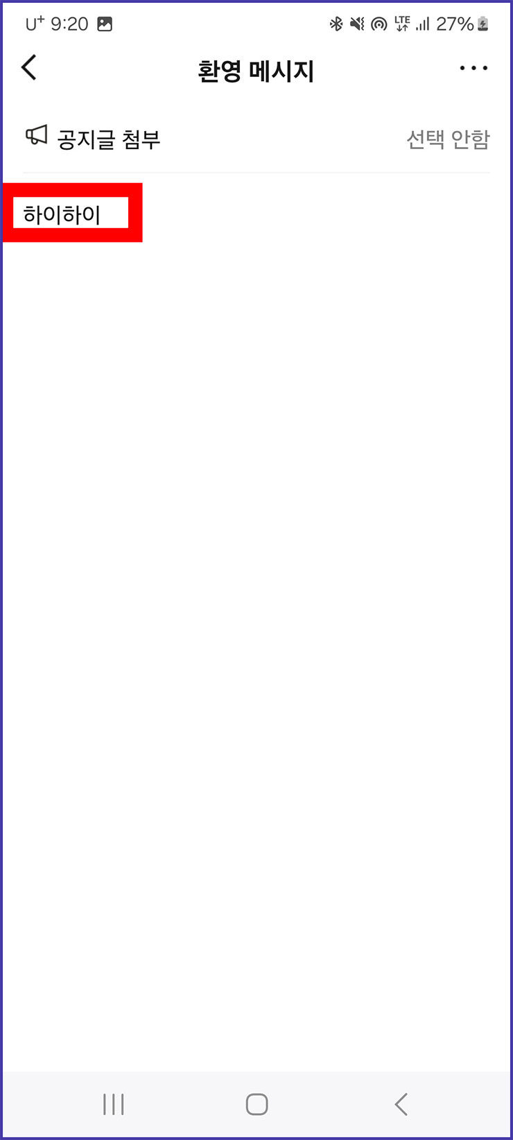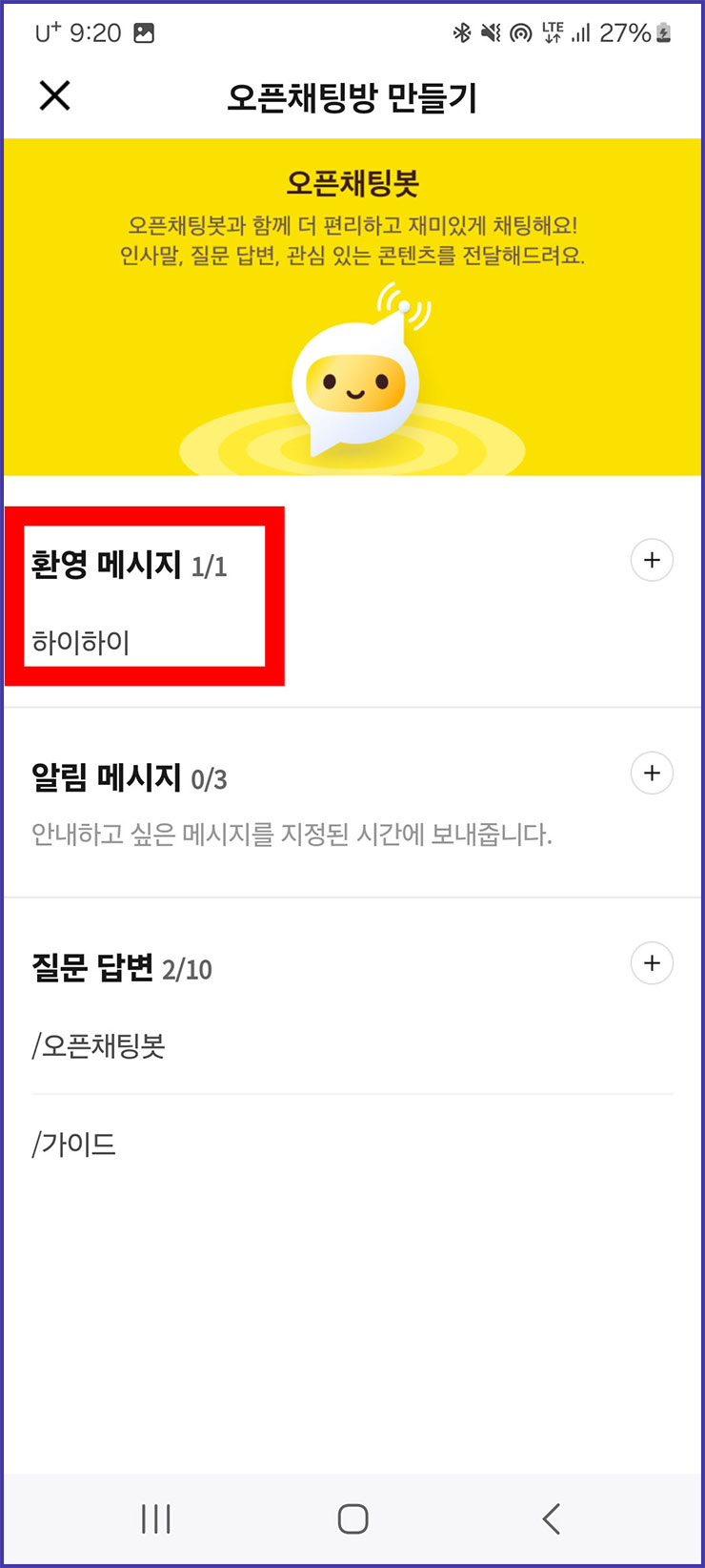 ■ 이렇게 환영 메시지가 등록된 것을 확인할 수 있습니다. 알림 메시지와 질문 답변은 어떤 것인지도 함께 알아보겠습니다.