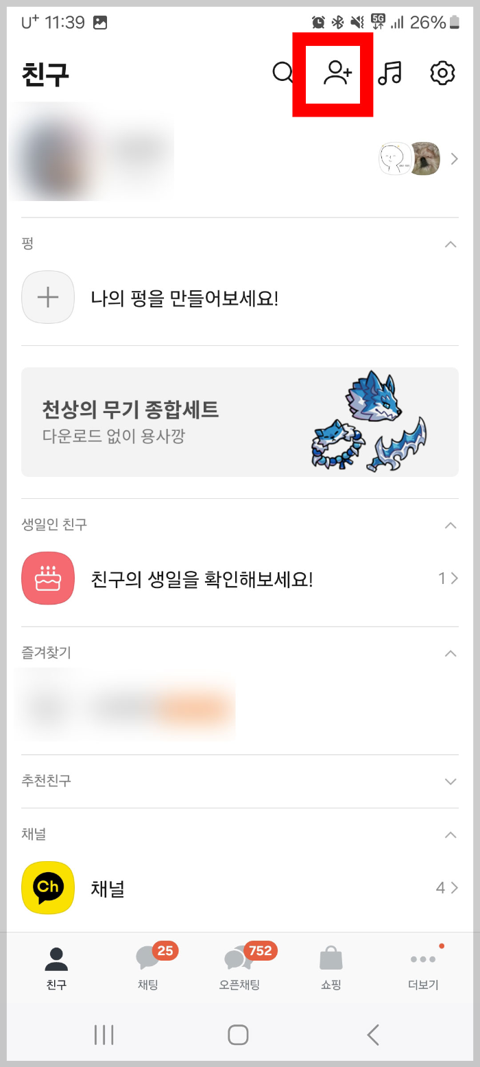 ■ 왜 카톡 추천친구에 내가 모르는, 혹은 아는 사람들이 뜨는 걸까요? 그 이유를 알기 위해서 먼저 [카톡 프로필 페이지]에서 오른쪽 상단에 있는 [플러스] 버튼을 들어가보겠습니다.
