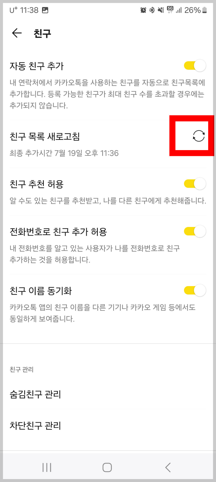 ■ 다양한 옵션들이 나옵니다. 제가 빨간 박스로 표시한 곳 아래에 보면 [친구 추천 허용]이라는 텍스트가 보입니다. [친구 추천 허용] 옆에 켜져 있는 노란색 버튼을 눌러서 [OFF]를 해주세요.