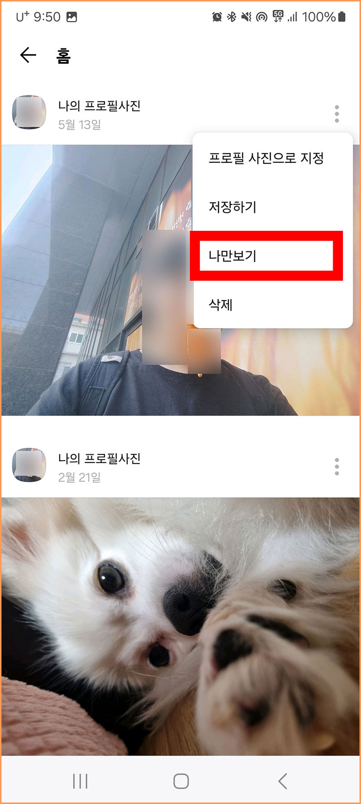 ■ 프로필 사진으로 지정 / 저장하기 / 나만보기 / 삭제로 총 4가지 선택지가 있습니다. 이 중에서 우리가 원하는 [나만보기]를 클릭해서 설정해주세요.