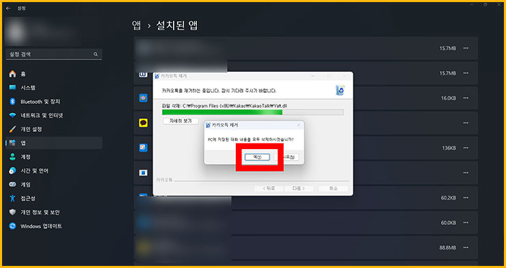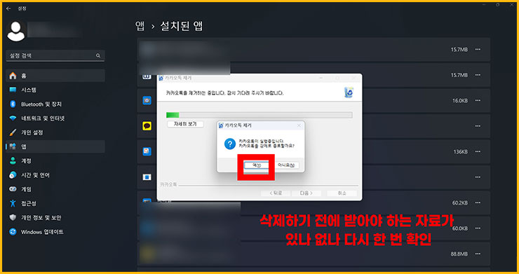 ■ 고민을 한 다음에 완전히 제거를 할 거라면, 이제 [예]를 눌러주세요.