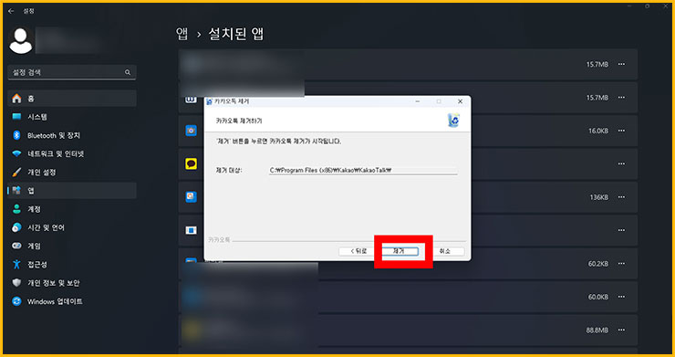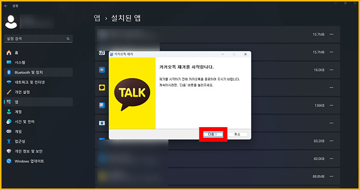 ■ 카카오톡 제거창이 나옵니다. [다음]을 누른 다음에 [제거]를 클릭해주세요.