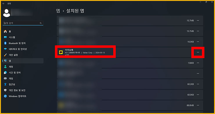 ■ 카카오톡 항목이 나옵니다. 해당 항목에서 오른쪽에 있는 [삼점]을 클릭해주세요.