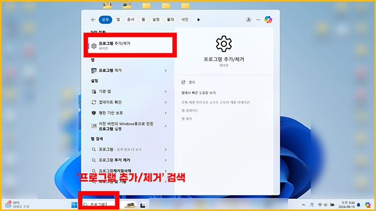 ■ 아래와 같이 닫혀있던 창이 열립니다. 해당 탭에서닥 [프로그램 추가 / 제거]를 검색해주세요. 그러면 위에 프로그램 추가/제거 라는 항목이 생깁니다. 맨 위에 있는 항목을 클릭해주세요.