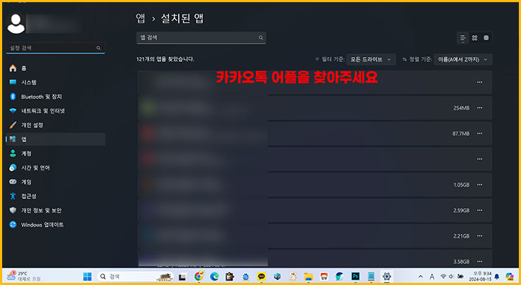 ■ 이제 설치된 앱 창이 나옵니다. 여기서 우리가 삭제해야 하는 [카카오톡 어플]을 찾아주세요. 보통 스크롤을 조금 내리면 나옵니다.